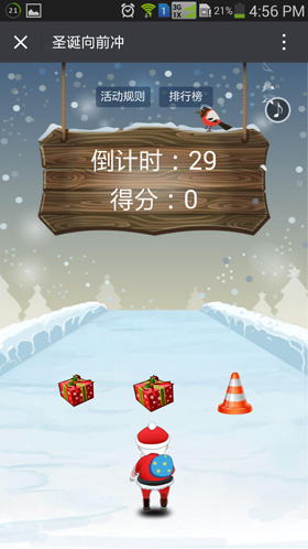 圣诞向前冲是一款躲避类型的游戏,玩家控制圣诞老人移动位置,躲避障碍物和接到礼物,遇到障碍物会扣除相应的积分,接到礼物会加积分,速度越来越快,在规定的时间内谁获得的礼物越多积分就越多,谁就能获得好的排行,得到相应的奖品!