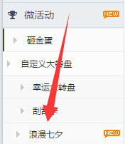 操作步骤:F5或者鼠标右键刷新网页-->在左侧菜单栏找到微活动-->微活动下找到浪漫七夕功能-->点击进入新增界面